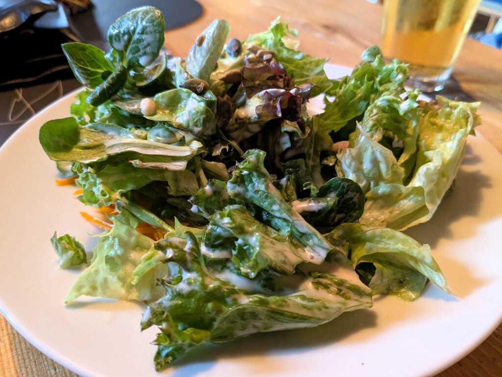 Während sich meine Frau an einer Salatplatte mit gebackenem Bergkäse und Baguette (18,90 Euro) gütlich tat, ließ ich mir den Zwiebelrostbraten mit Käsespätzle (29,90 Euro) mal so richtig schmecken. Vorweg bedurfte es lediglich einer kleinen, vegetabilen Einstimmung, was mir einen schmackig angemachten Beilagensalat (6,50 Euro) einbrachte.