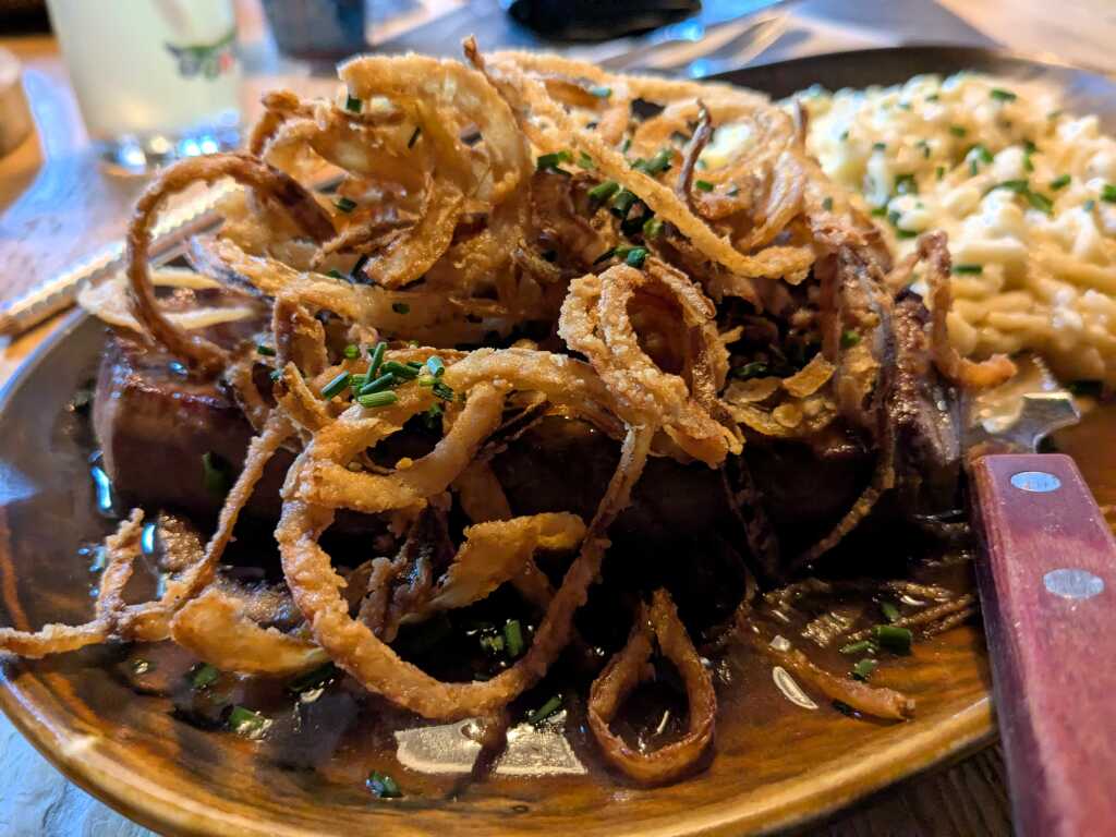 Doch zurück zu meiner unter einer dichten Röstzwiebelfrisur lauernden Tranche aus dem Rinderrücken. Die wurde im gewünschten Gargrad „medium rare“ geliefert und von einer kräftigen Jus umspült. Ein Rostbraten wie aus dem Bilderbuch für deftige Wiener Fleischgerichte.