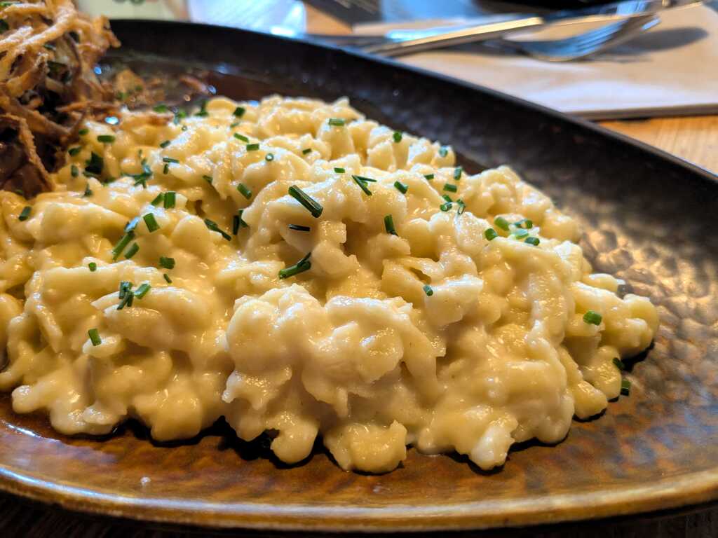 Flankiert von schlotzig-cremigen Spätzle (eigentlich waren es Knöpfle…), die keine Sättigung scheuten, war das ein astreiner Wohlfühlteller für einen ausgehungerten Karnivoren.