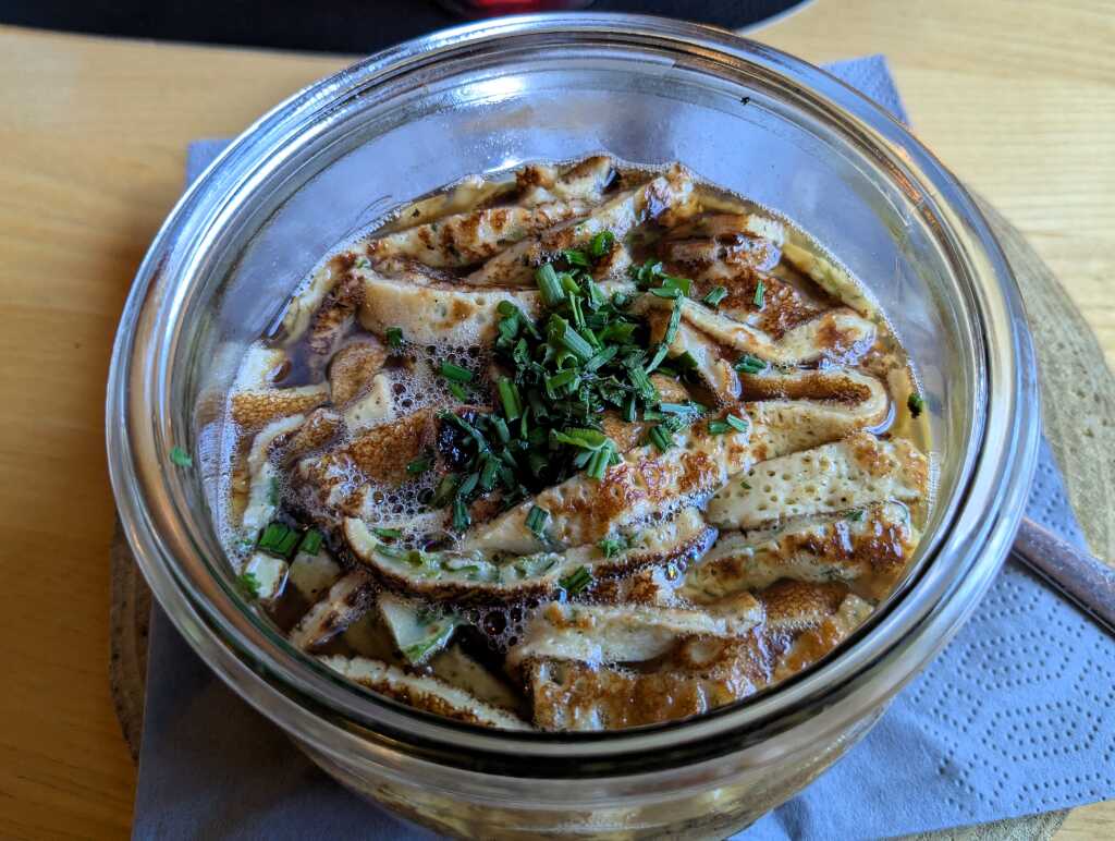 Am nächsten Abend löffelte ich eine herzhafte Rindersuppe mit Pfannkuchenstreifen aus dem Einweckglas (5,90 Euro). In der heißen Brühe tummelten sich jede Menge fluffiger Flädle. Ach, solche klaren Terrinen können bei entsprechender Einlage schon eine Wohltat sein.