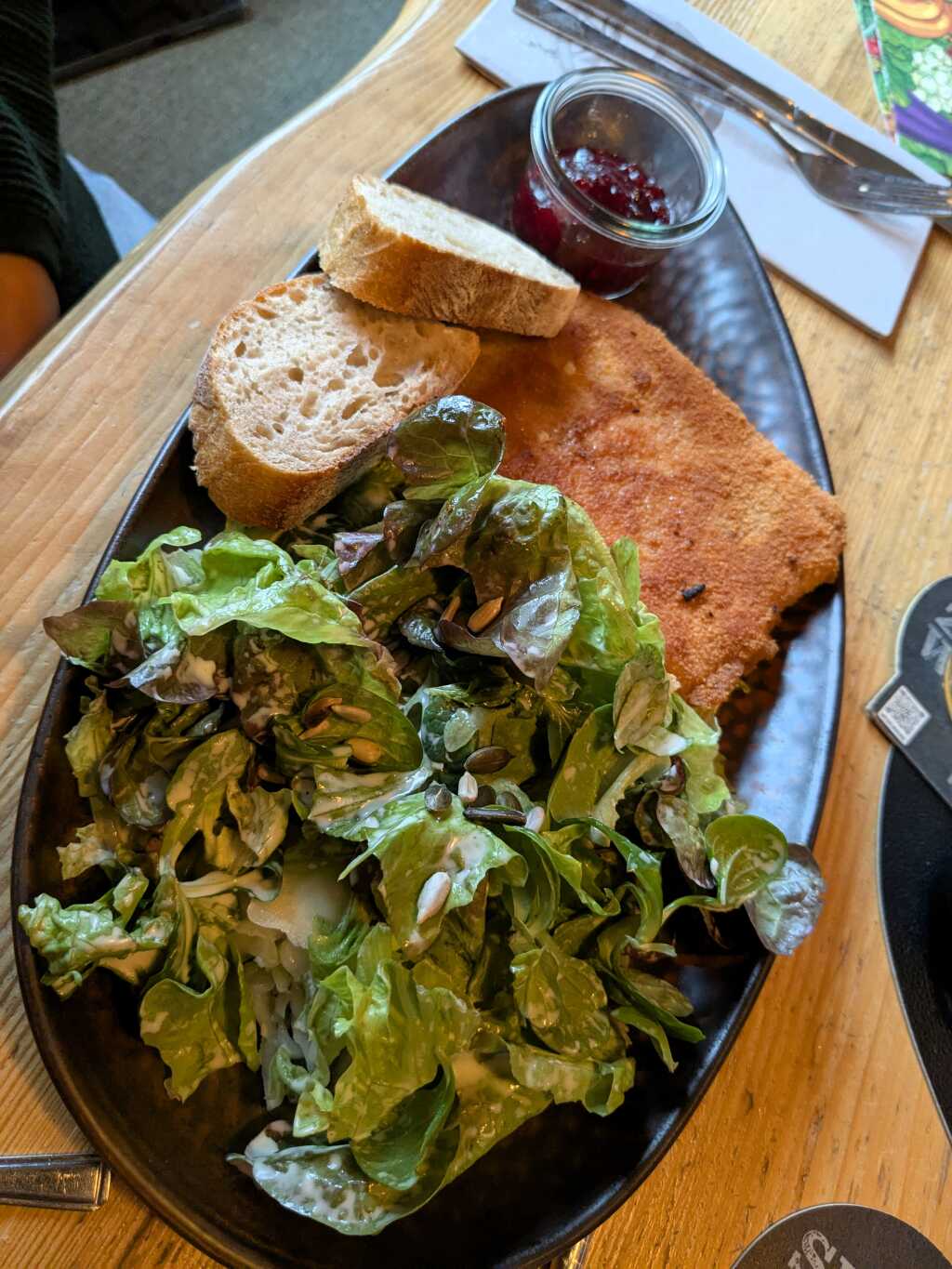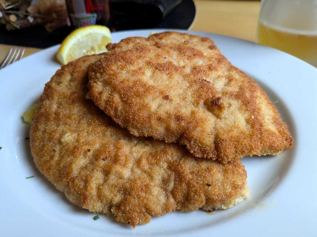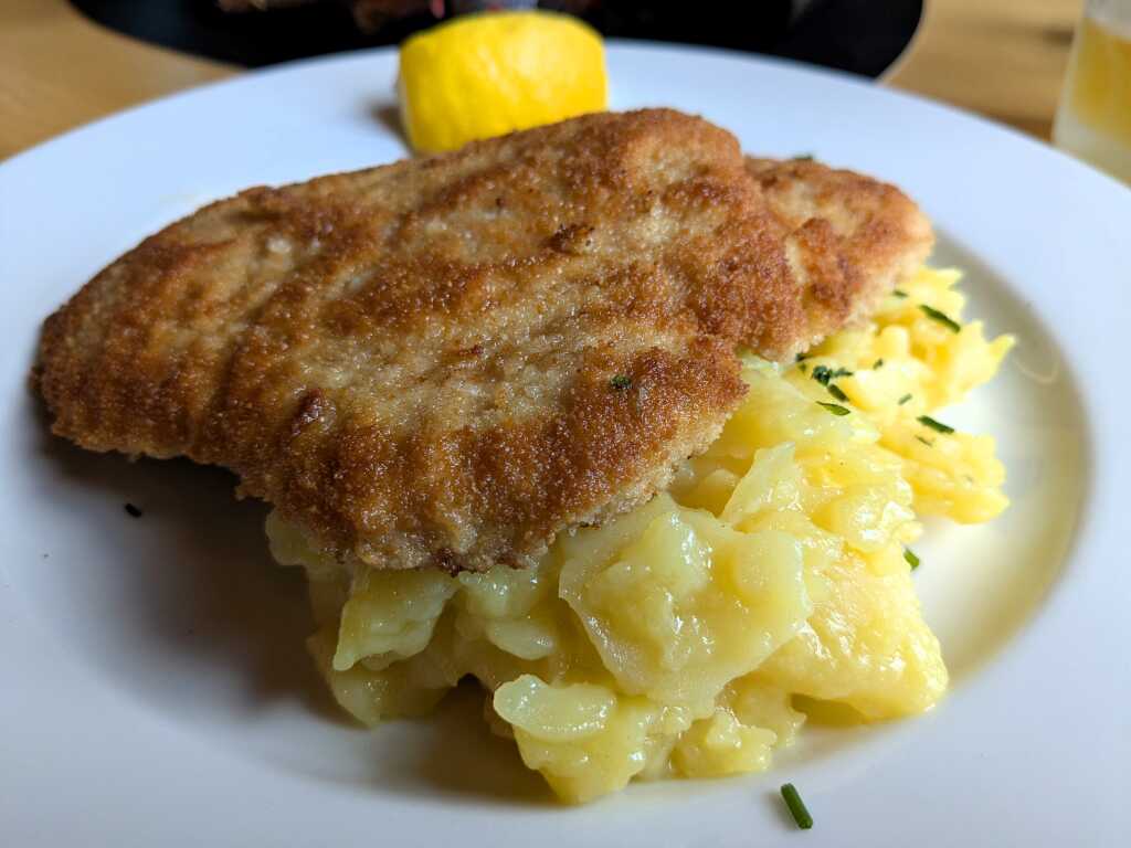 Da fiel mir die Entscheidung am nächsten Abend leicht: da der Kartoffelsalat nur als Beilage zum Schnitzel „Wiener Art“ serviert wurde, kam ich quasi nicht umhin, mich dem schweinernen Panierstück anzunehmen. Genauer gesagt waren es zwei…