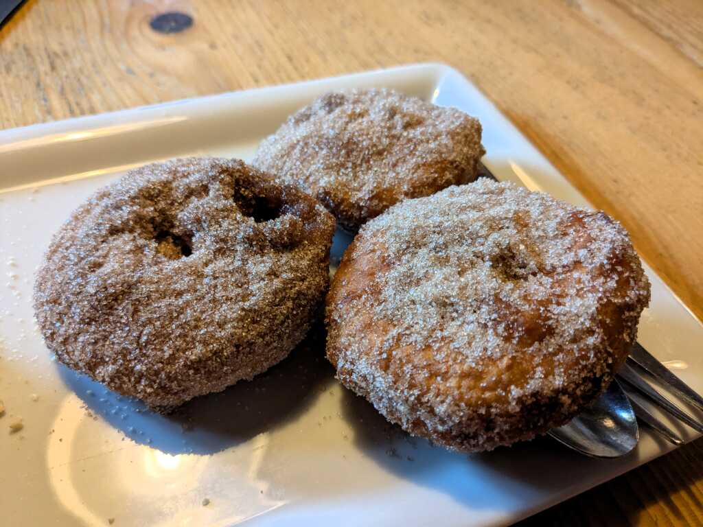 Keine Ahnung, wie mir das gastrale Kunststück gelang, danach noch drei im Bierteig ausgebackene, mit Zimt und Zucker bestreute Apfelküchle mit Vanilleeis und Sahne (11,50 Euro) zu verdrücken. Aber ich glaube, mir wurde geholfen…
