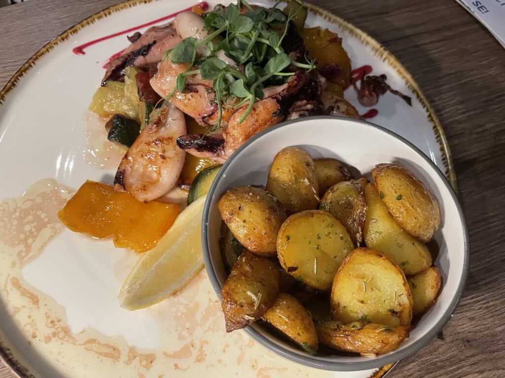 Es schmeckt auch noch prima. Die Schweinefiletbestandteile des Pola Pola (20,90 Euro) hätten allerdings noch ein paar Minuten länger gebraucht und das vermutlich selbstgemachte Ajvar hätte ruhig etwas pikanter ausfallen dürfen. Dafür sind die Tuben der gegrillten Calamari (23,90 Euro) butterzart, die kleinen Tentakel herrlich kross, die dazu servierten Rosmarinkartoffeln schön würzig. Beim Grillgemüse sind wir allerdings nicht so sehr Fan von Zucchini, dafür überrascht eine rote Dekosauce, die man erst für Ketchup halten könnte, laut Karte jedoch Rote-Bete-Creme ist. Dazu munden das Benediktiner Hefe alkfrei (4,90 Euro) und das Weissweinschorle (4,50 Euro). Als Fehlgriff entpuppt sich allerdings die Blutorangen-Limo (5,90 Euro) – so pappsüss, dass vermutlich nur Kinder eine Freude daran haben können.