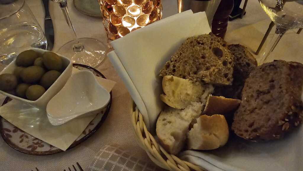 Dann wurde uns das auf der Speisekarte angekündigte „Gedeck“ zu € 2,90 serviert. Grüne Oliven und 2 Sorten angetrocknetes Brot.
