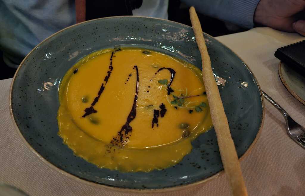 Mein Mann hatte klüger gewählt. Die Kürbiscremesuppe, serviert mit Kürbiskernöl, Kürbiskernen und einem Grissini zu € 16,90, wurde heiß serviert und wärmte von innen.