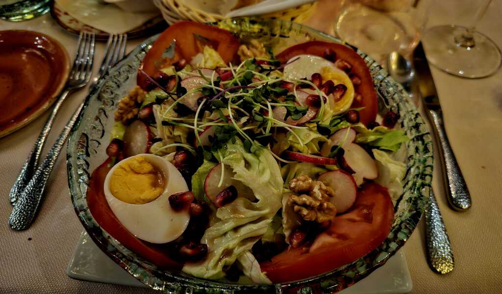 Für mich der Salat Classic: Kopfsalat, Tomaten, Freilandei, Granatapfel, Wallnüsse, Hausdressing zu € 19,90.