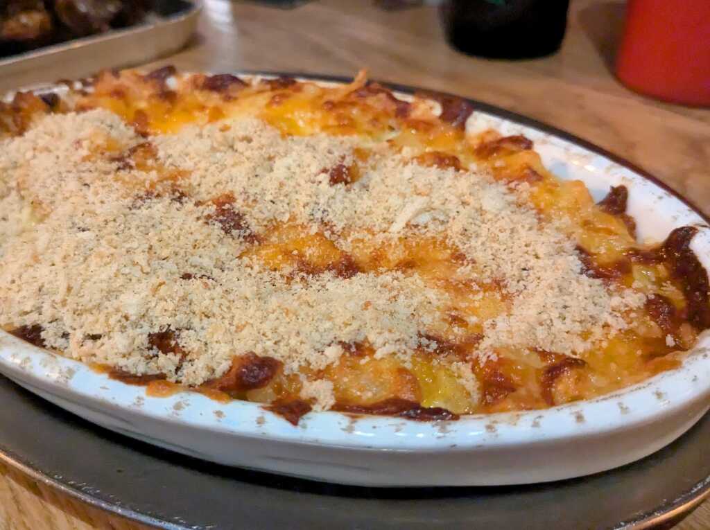 Ein paar Pommes, die hier selbstverständlich unter dem Namen „French Fries“ (6,50 Euro) firmierten, sowie eine kleine Auflaufform mit gratinierten Käse-Maccheroni (mit Pankomehl…), die nicht nur der gelernte Sizzle-Brother als „Mac & Cheese“ (7,50 Euro) bezeichnen bzw. bestellen würde. Da hatten wir also ganz schön was vor…