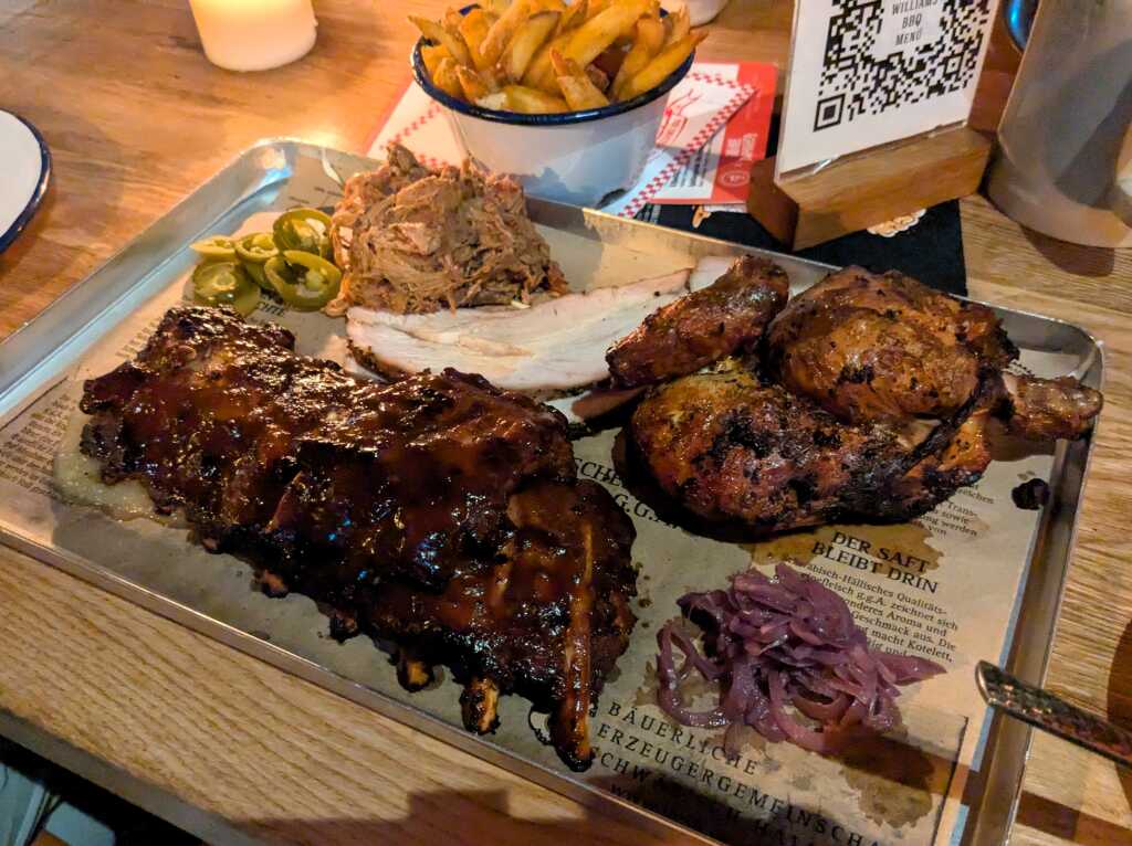 Beim Studium des nicht minder hip, aber doch sehr informativ und übersichtlich gestalteten Speiseplans stach den beiden Fleischgesinnten sofort die „Chicago Williams Meat Platter“ für zwei Personen (damals noch für lukrative 58 Euro zu haben – mittlerweile verlangt man dafür 90 Tacken, hat aber auch ein paar BBQ-Leckereien zusätzlich auf der Platte…) ins Auge.