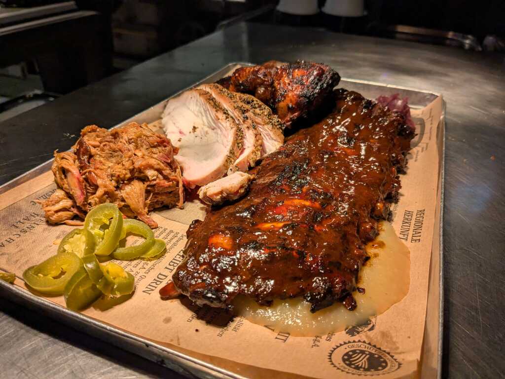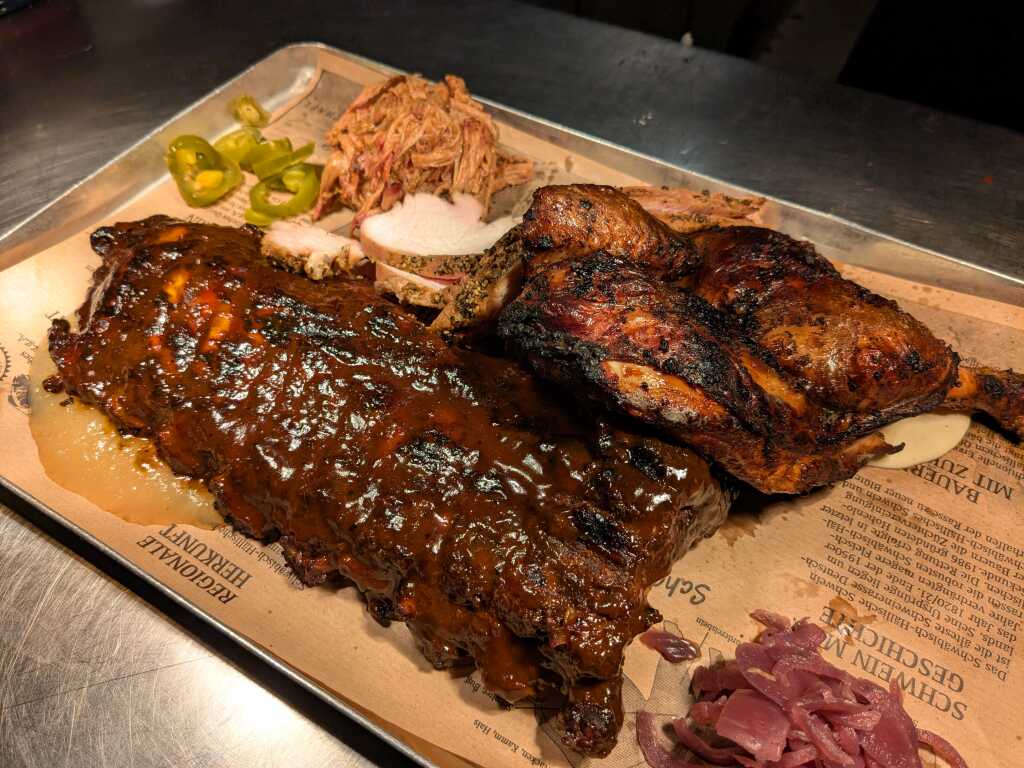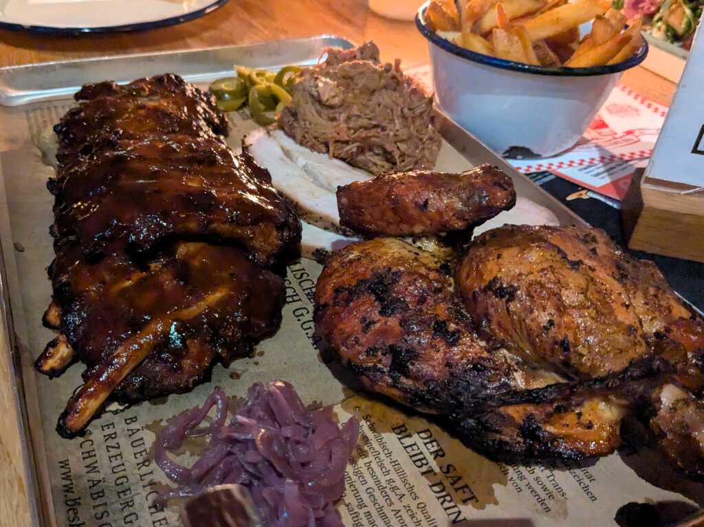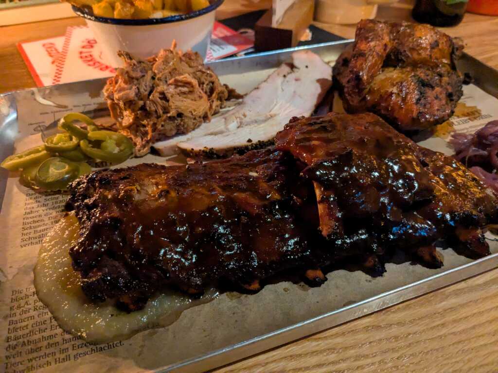 Neben einem stattlichen Pulled-Pork-Hügel und einem halben Freilandhähnchen, hatten es sich noch ein mit hausgemachter BBQ-Sauce bepinseltes Spare-Ribs-Rack und zwei dicke Scheiben Truthahnbrust mit Pfefferrand auf dem Alu-Rechteck gemütlich gemacht. Gepickelte, rote Zwiebeln, ein Klecks Apfelmus (unter den Rippchen) und ein Häufchen Jalapenos ergänzten die aufs Wesentliche reduzierte Fleischplatte für Zwei.