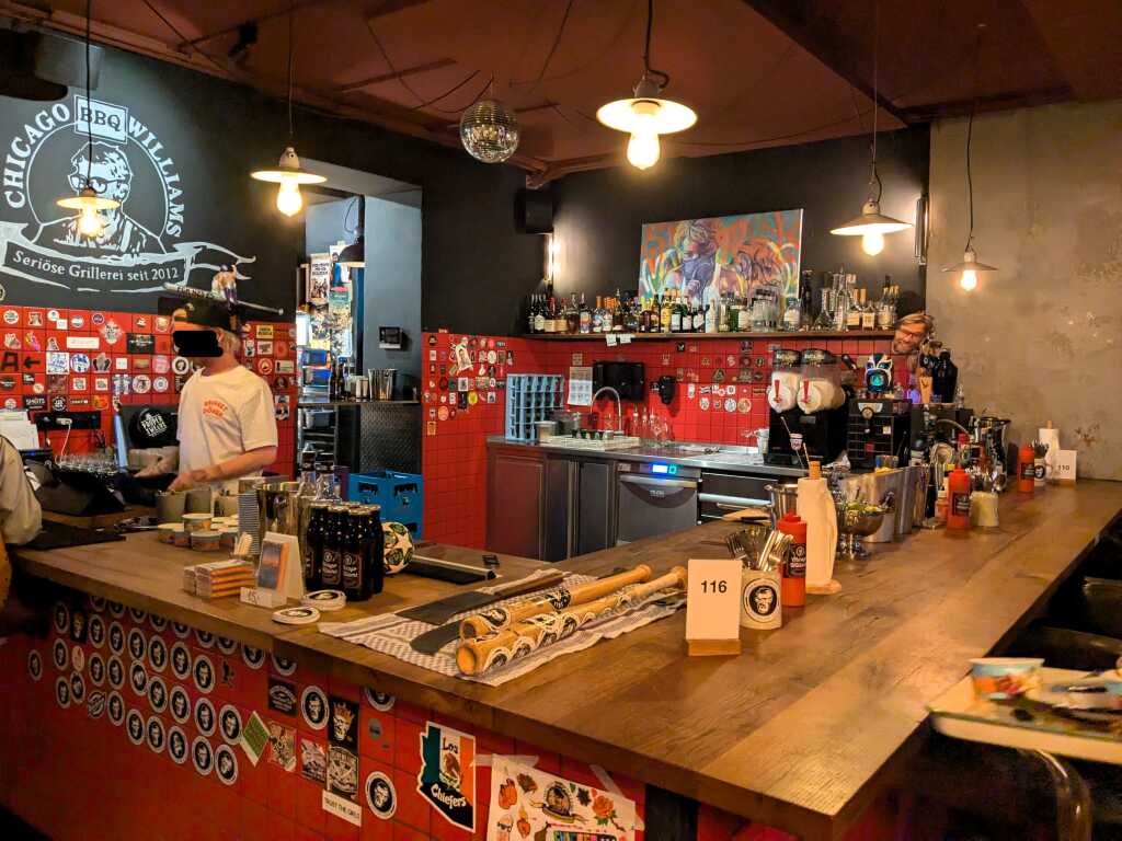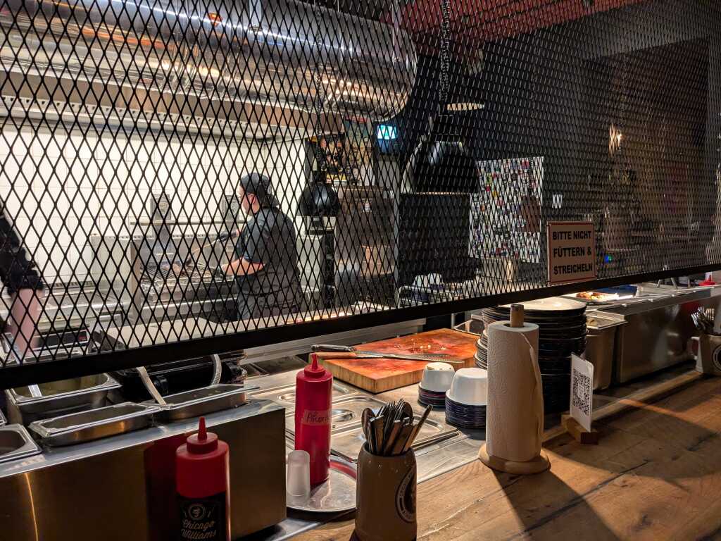 Von meinem Platz aus hatte ich den hinter Gitter werkelnden Pitmaster – das Schild „Bitte nicht füttern und streicheln!“ erheiterte nicht nur mich – fest im Blick. An dem vorgelagerten Tresen hätte ich als Alleinesser wohl gerne einen „Counter-Seat“ bezogen. So nach dem Motto „Kannste dir bestimmt watt abkieken“.