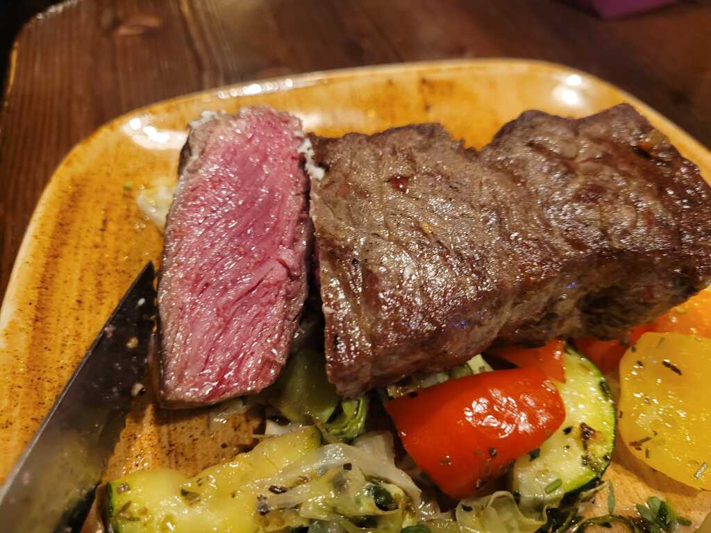 - Rumpsteak medium gebraten mit Rösti und gemischtem Salat - perfekt 29,90 Euro , wobei die beiden Beilagensalate mit weiteren je 3,50 Euro zu Buche schlugen .