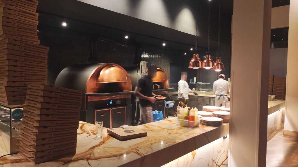 Natürlich dauerte es eine kleine Zeit, bis die Beilagensalate kamen. Und in der Zeit hatte ich, neben den Gesprächen mit dem Kollegen, natürlich des optimalen Emporenplatzes geschuldet, die Gelegenheit den Teigbeleger(n) (Pizzaiolo wäre zu euphemistisch!) zuzuschauen. Und was sagt Pizzapapst Teichner immer? „Wenn die Tomatensoße drauf kommt, dann läuft die Zeit! Irgendwann suppt sie sonst nämlich durch“.