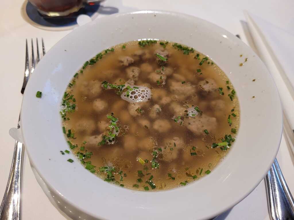 Nach mehr schmeckte auch die Leberspätzlesuppe, die 5 Minuten nach unseren Getränken kam. Schön heiß, mit reichlich Einlage dieser selbst gemachten Leberspätzle, mild gewürzt in einer klaren Brühe und obenauf etwas (TK) Petersilie. Das alles auf einem tiefen Teller angerichtet, so hätte das von der Menge her schon fast eine kleine Hauptspeise sein können. So lieben wir die Leberspätzlesuppe, und ist für uns bei jedem Bayernbesuch ein Muss.