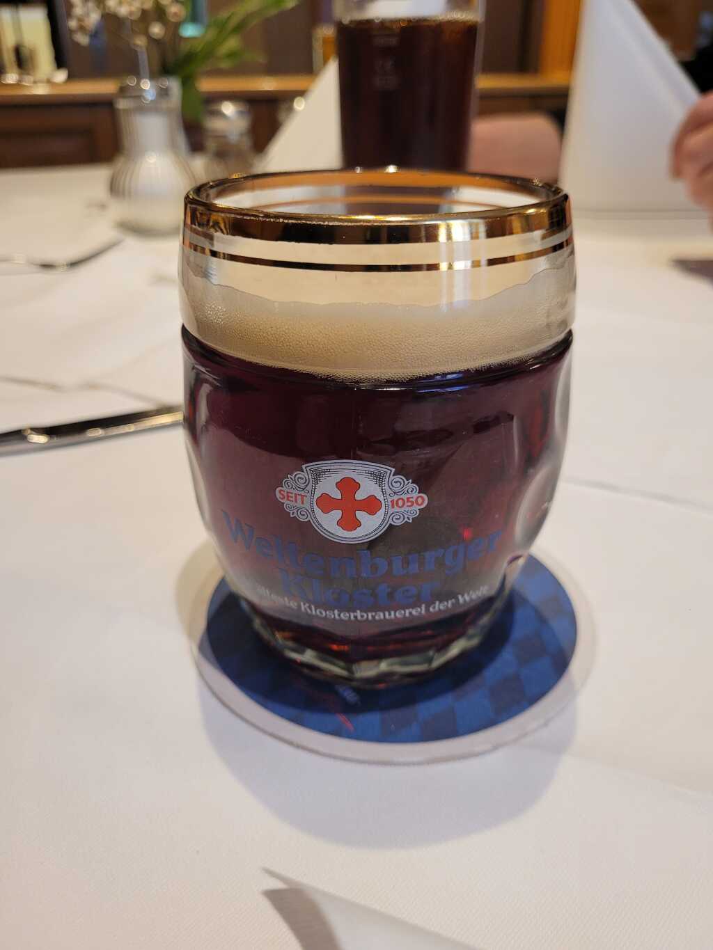 Fünf Minuten nach unserer Bestellung waren unsere Getränke am Tisch. Endlich konnten wir beiden Herren auch einmal dieses süffige Bier aus der Weltenburger Klosterbrauerei kosten, welches wir ja im gleichnamigen Kloster leider nicht bekommen hatten. Hier aber nun endlich, aber schade, dass wir noch Auto fahren mussten, denn es schmeckte eindeutig nach mehr…..