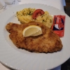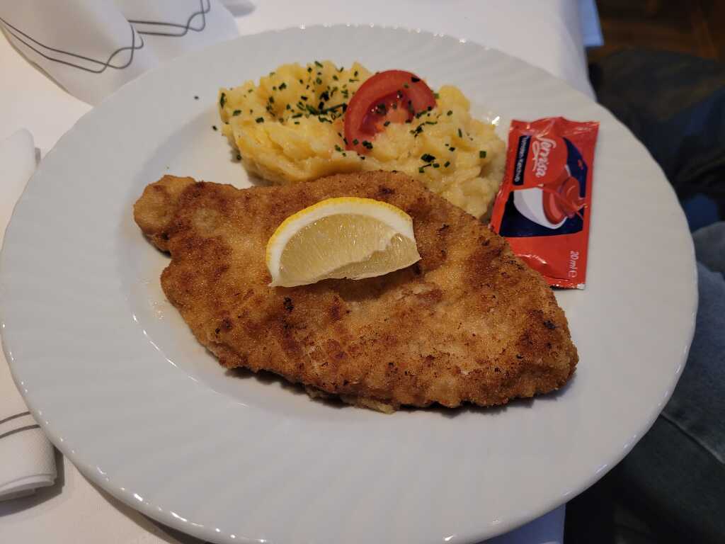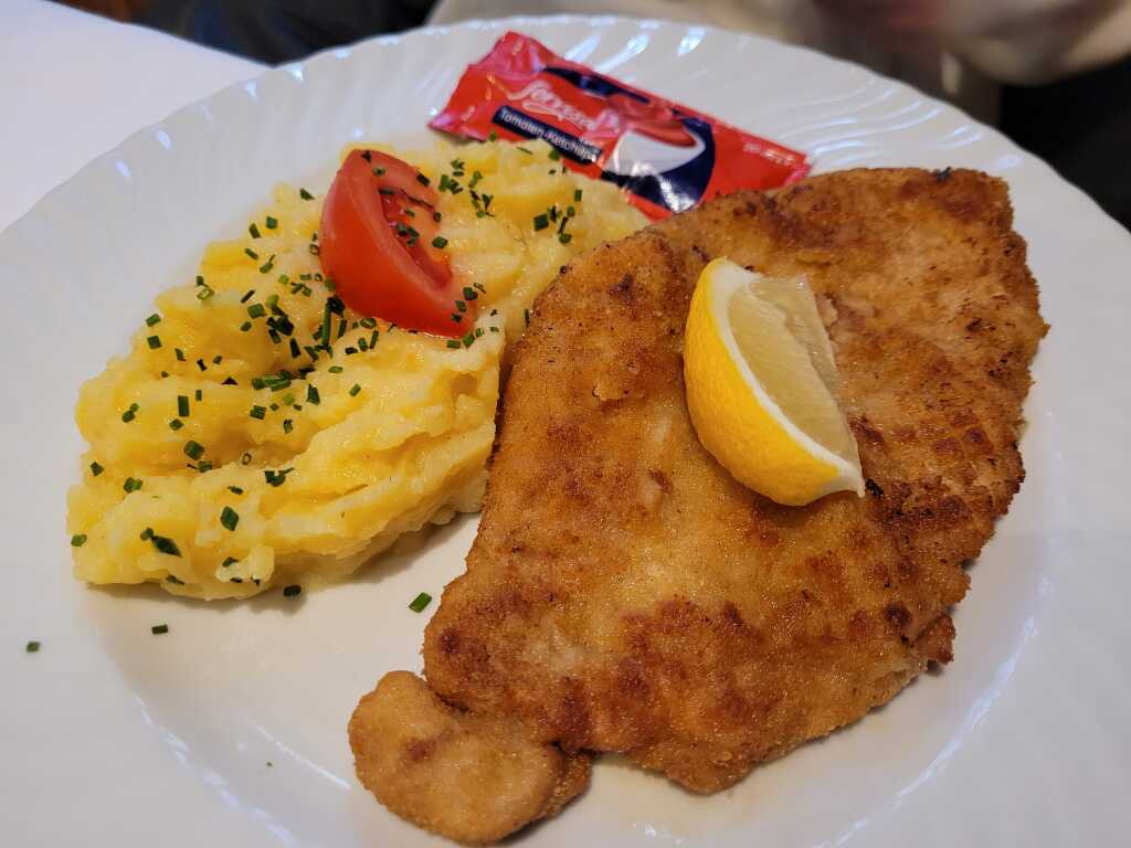 Das Töchterchen unsrer Freunde wollte sich nicht so recht an die deftigen, bayrischen Gerichte wagen, aber Schnitzel geht ja immer, und so hatte sie sich das Schnitzel „Wiener Art“ mit Kartoffelsalat bestellt.