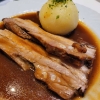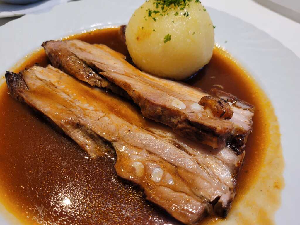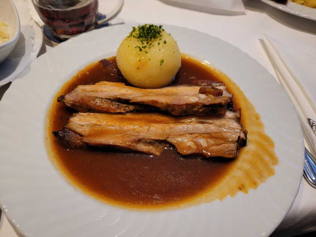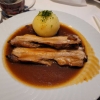 Aber auch hier wurden wir nicht enttäuscht, denn wer es etwas deftiger und herzhafter mag, war hier richtig. Zwei dicke Scheiben Schweinebauch lagen da auf dem Teller. Ordentlich durchzogen mit Fett, und hier und da auch noch ein kleiner Knorpel mit drin. Das Fleisch schön zart, aber noch gut und fest im Biss. Dazu ein selbstgemachter Kartoffelknödel, das Beste aber war die Soße. Diese war richtig schön kräftig im Geschmack, angenehm dunkel in der Farbe und passend zu dem Essen. Da der Kartoffelknödel die Sauce nicht aufnehmen konnte, ließ ich es mir entgegen meiner guten Erziehung nicht nehmen, diese am Ende mit einem kleinen Löffel restlos zu verputzen.
