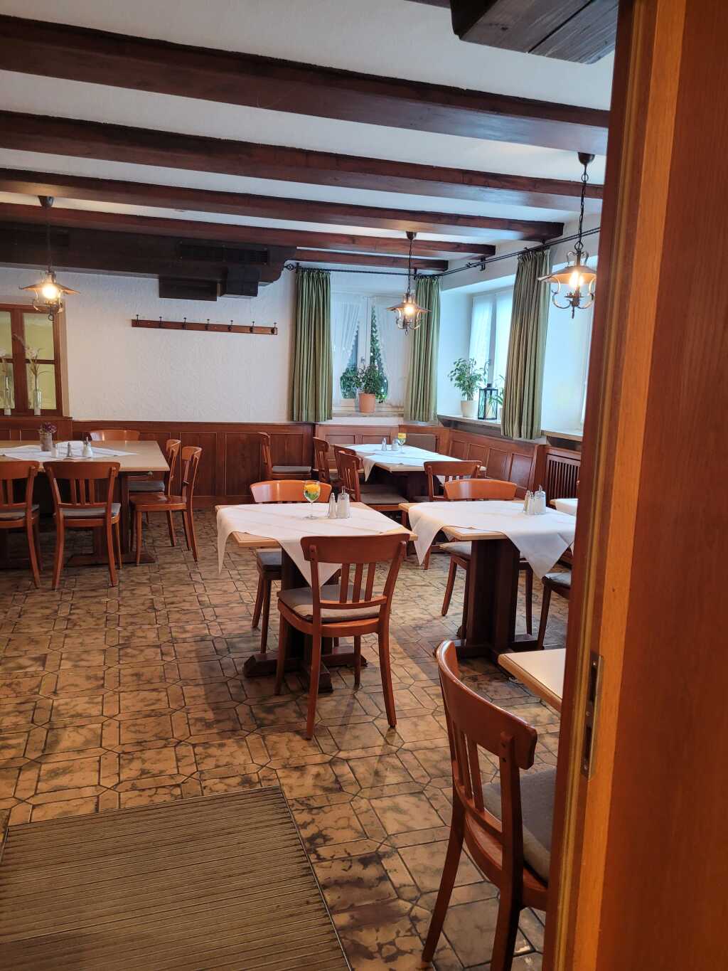 Stühle und Tische standen dem nichts nach, und auch der Parkettboden gab ein passendes Bild. Auf den Stühlen und Bänken, welche rings um die Wand waren, saß man sehr bequem, die Tische bieten ausreichend Platz. Die Theke des Gasthofes befand sich im Nachbarraum.