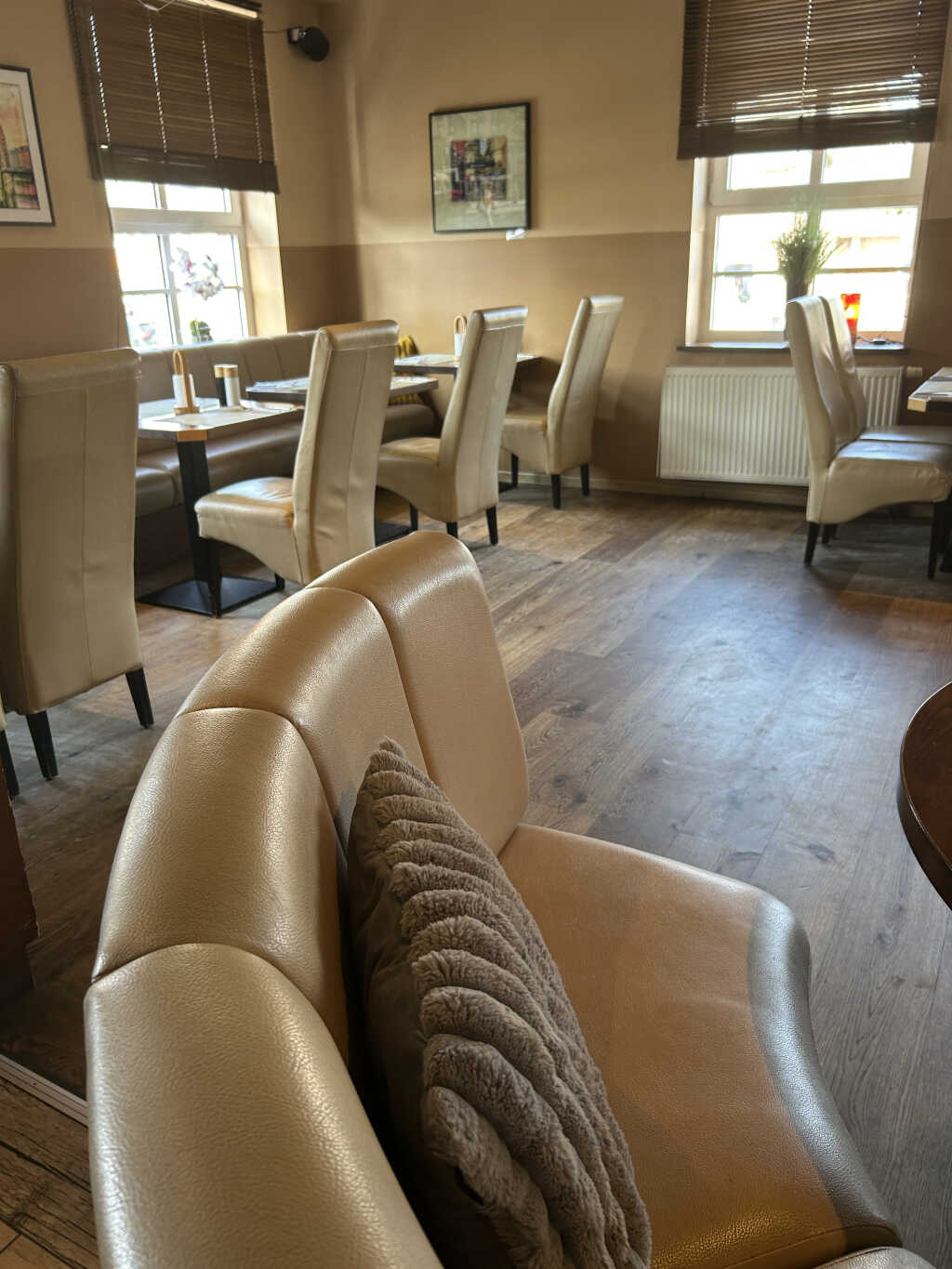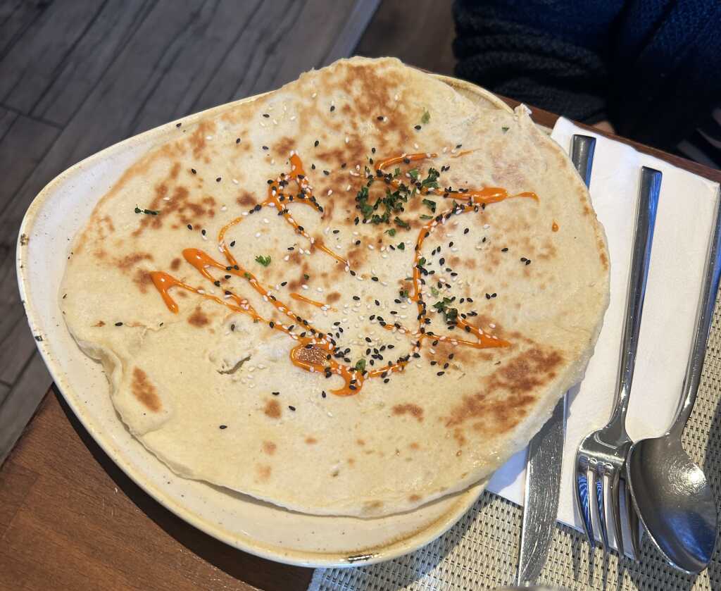 Diesmal gab es eine braune Speisekarte mit Ledereinband und Klarsichthüllen. Wir haben nur die Mittagskarte angeschaut. Die Gerichte gibt es von Montag bis Samstag von 11.30-14.30. Finden wir schön dass sie es auch Samstags anbieten. Es ist eine schöne Auswahl vorhanden. Vorspeisen werden angeboten so wie auch Lamm – und Fischgerichte. Findet man selten. Man kann sie auch auf der HP ansehen und bei unserem Besuch war sie aktuell.