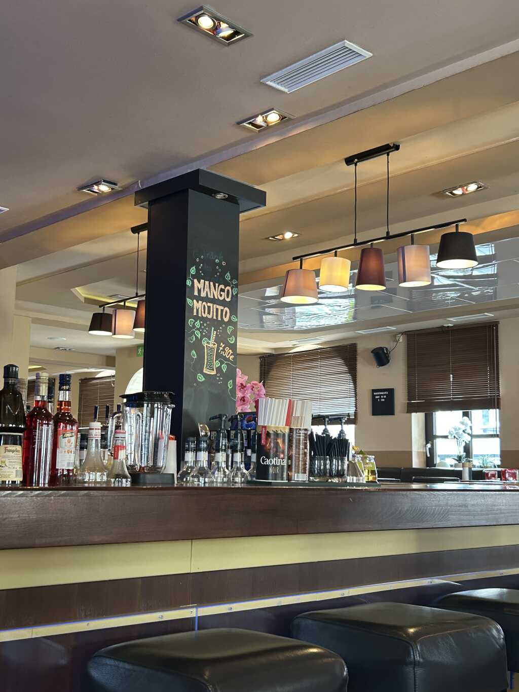 Es gibt hier Teils runde , Teils Eckige Tische. Mal Stühle , mal Bänke. Es ist alles in weiß und blau gehalten. Blumen zieren die Abgrenzungen, es ist hell Beleuchtet und an der Wand gibt es ein paar Bilder. Säulen sind auch vorhanden für den griechischen Flair.