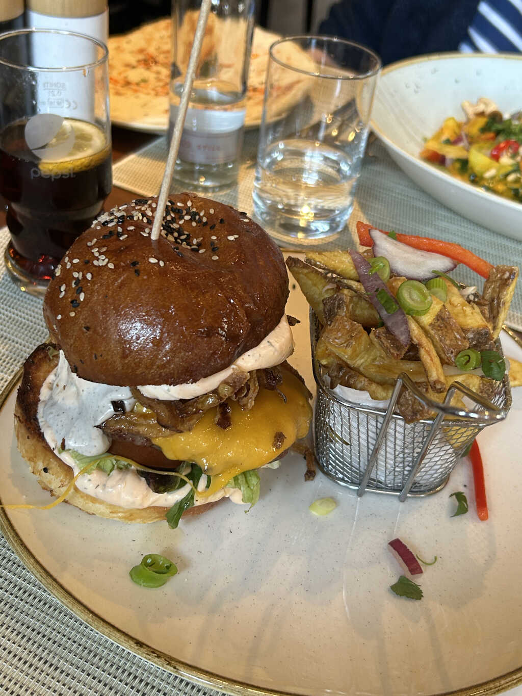Der Beilagensalat bestand wieder aus Weißkraut und Gelberübenstreifen, alles frisch. Er war schön angemacht mit einem leichten süßlichen Touch. Dazu gesellte sich in Streifen geschnittener Eisbergsalat. Die obligatorische Tomatenscheibe ( die in dieser Jahreszeit keinen Geschmack hat ) gab es oben mit drauf und ein paar grobe Zwiebelringe. Das Dressing fanden wir diesmal besser, schöne Säurenote, mit kleinen Gemüsewürfelchen versetzt und gut abgeschmeckt. Ein paar Kräuter gesellten sich auch mit dazu.