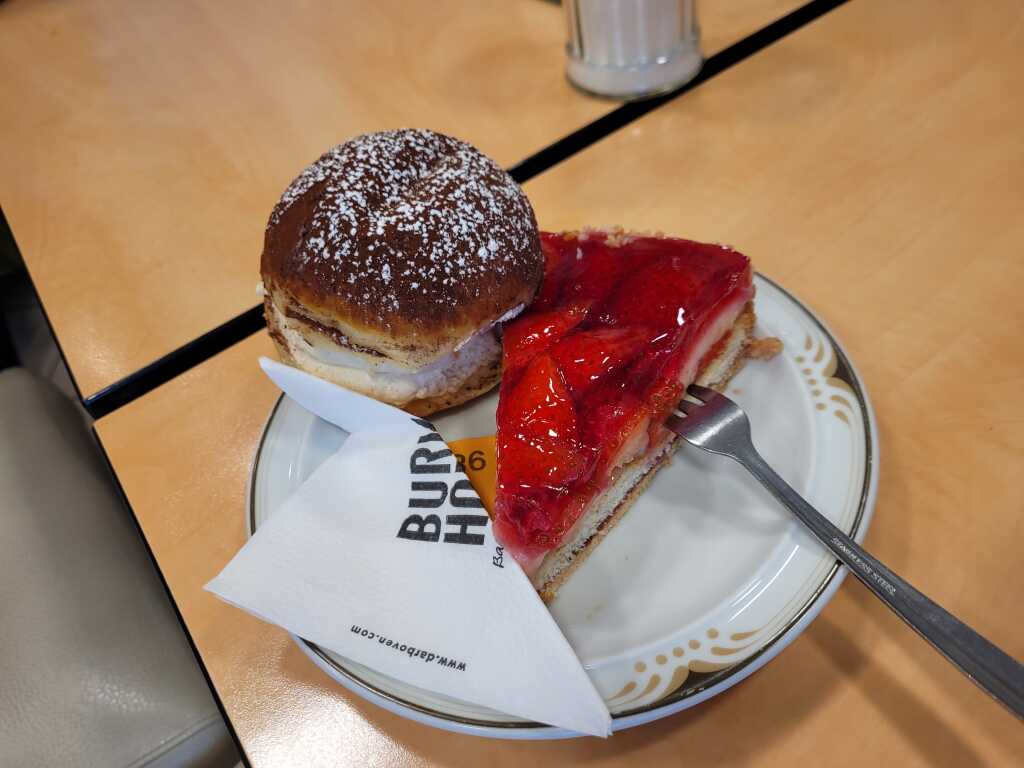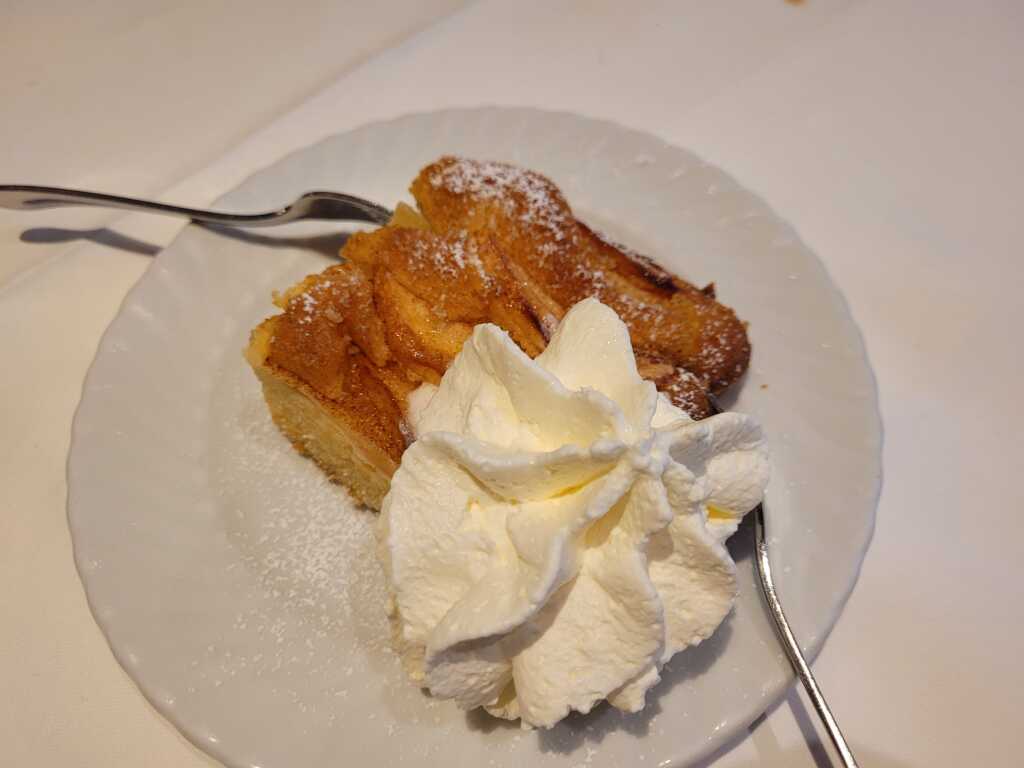 Eigentlich waren wir satt und zufrieden, aber Frau Jenome hatte dann doch noch etwas Platz im Dessert Magen gefunden, und so sollte es noch ein Hausgemachter Apfelkuchen mit Sahne für 4,20 € sein. Diesen teilte sie sich letztendlich mit dem Mann meiner Freundin, denn seine sehnsüchtigen Blicke nach was Süßem konnte sie auch nicht ertragen. Beide waren zufrieden, war der Kuchen doch schön fluffig und gut im Geschmack.