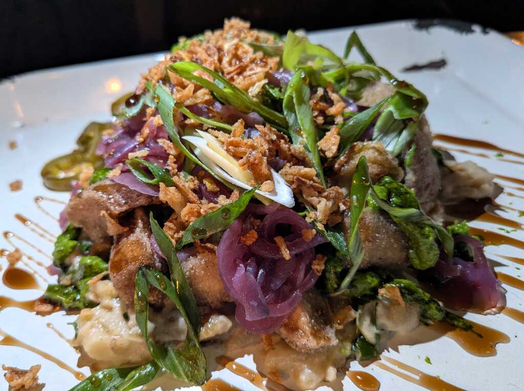 Eine der Kolleginnen entschied sich für die „Smoked Eggplant“ (14,50 Euro), die später mit einem bunten Zwiebelmix (eingelegte rote Zwiebeln, Röstzwiebeln und Frühlingslauch), Baba Ganoush (Auberginenpüree), und Granatapfel-Kernen geliefert wurde.