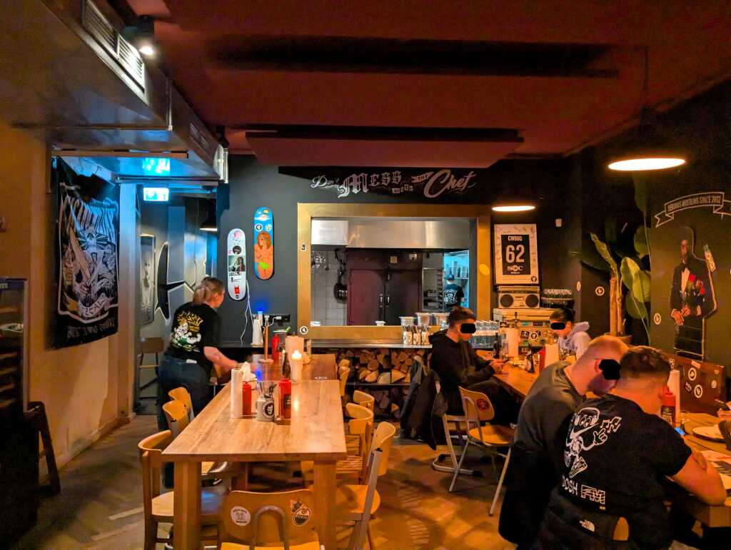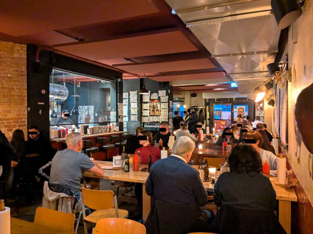 Um uns herum bestimmte ein auf ausgelassener Geselligkeit beruhender, energiegeladener „Buzzing Vibe“ die Szenerie. An der Decke angebrachte Schallschutzelemente schluckten einen Großteil des Geplappers, aber eben nicht alles. Wir saßen auf einfachem Holzgestühl – wie man es auch in den Klassenräumen weiterführender Schulen häufig vorfindet – an einem langen Holztisch, den wir uns mit einer anderen Gruppe (drei Personen) teilten – „Family Style“ halt.