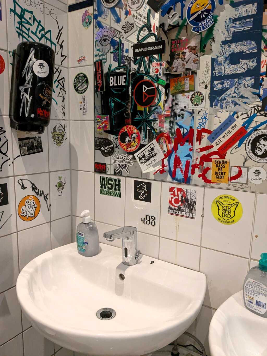 Bei einem Besuch der Nassräume fielen mir die vielen Aufkleber rund ums Waschbecken auf. Nur fehlte da noch einer aus der Pfalz. Ein aus Krankheitsgründen daheimgebliebener Schüler (FCK-Fan) hatte mich im Vorfeld mit genügend teuflischem Klebematerial in Rot-Weiß versorgt. Ich musste ihm diesen Gefallen einfach tun und konnte deshalb gar nicht anders, als an die „uneinnehmbare“ Bastion „Betzenberg“ zu erinnern…