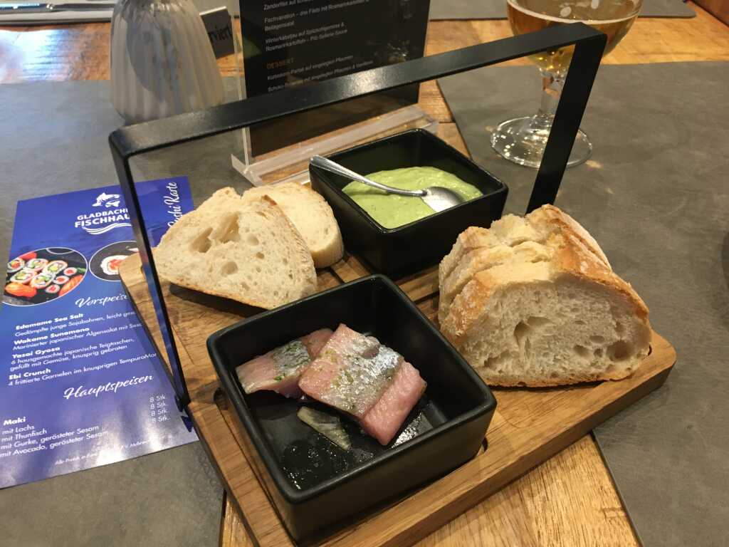 vorweg: Brot, Aufstrich, frische Fischstückchen