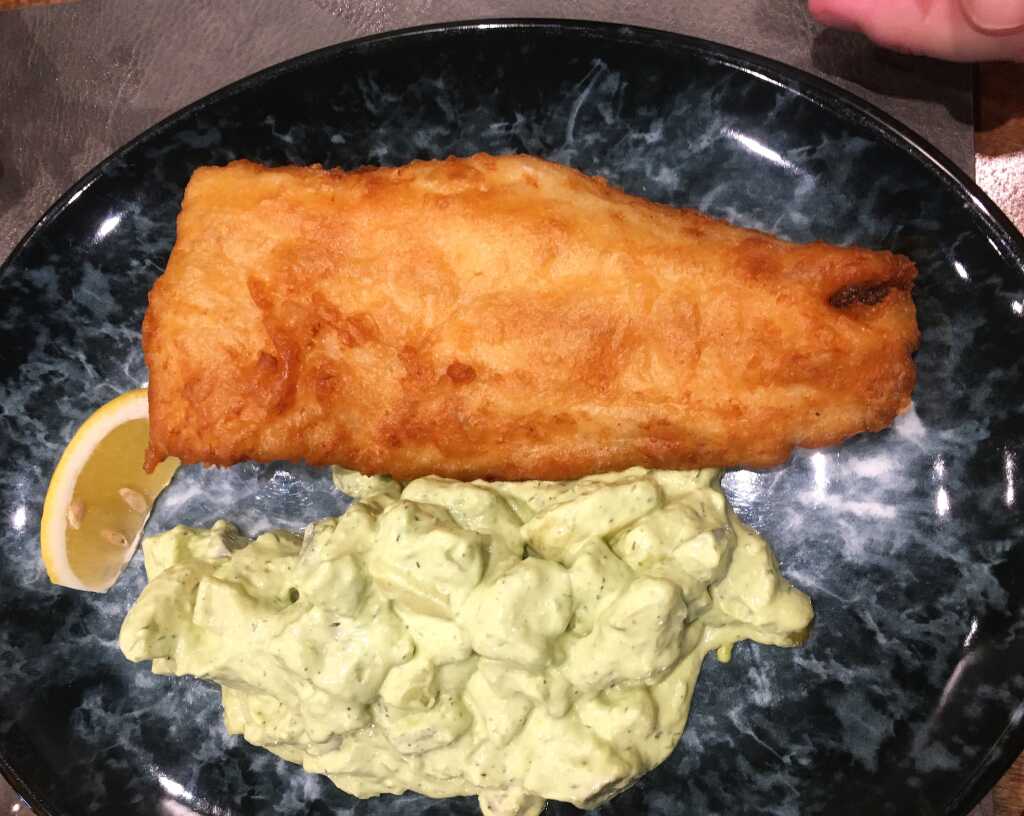 Frittierter Backfisch im Teigmantel mit Kartoffelsalat (16,90 €)