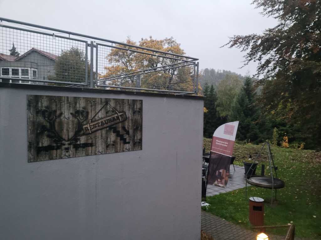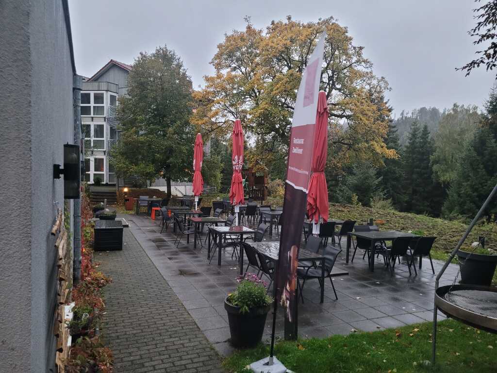 Eine zusätzliche überdachte Terrasse im Anbau erweitert das Sitzangebot , diese wird im Winter in einen beheizten Wintergarten umgewandelt. In den wärmeren Jahreszeit stehen Tische und Stühle auch vor dem Lokal zur Verfügung.
