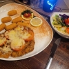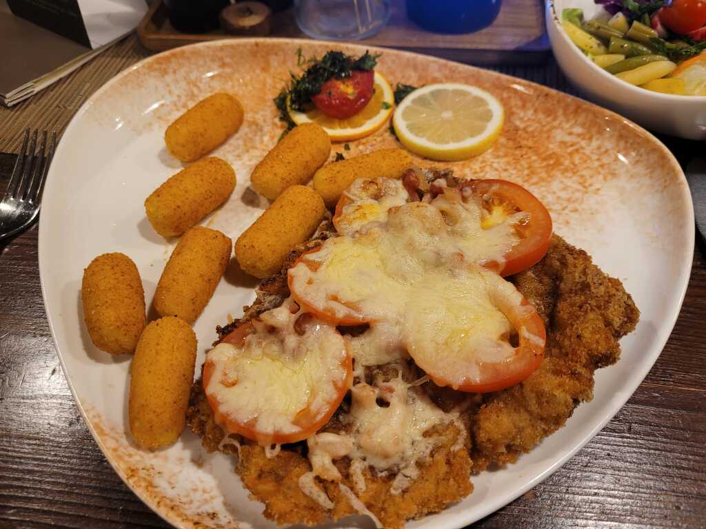 - Berner Schnitzel = Schweineschnitzel mit Tomaten , Schinken und reichlich Käse überbacken, Bratkartoffel und Salatteller - prima 15.90 Euro