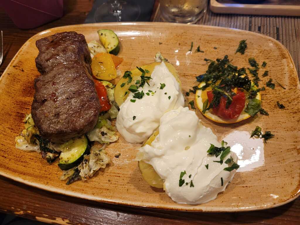 - Spezial für 2 = heißer Stein mit 3 versch. Saucen , 3 versch. Fleischsorten ( Schweinefilet, Ochsenfetzen und Rumpsteak ) Grilltomaten , Mais und Ofenkartoffeln mit Kräuterschmand - ein Träumchen 34,90 Euro