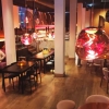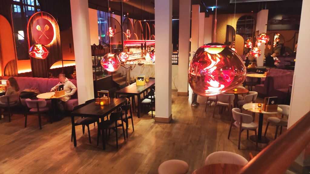 Kommt man rein, dann eröffnet sich einem ein sehr hoher und weitläufiger Raum welcher durch seine extravaganten Deckenleuchter, die ein orange changierendes Licht ausstrahlen, eine deutliche Spur Gemütlichkeit ausstrahlt. Das sieht schon sehr einladend aus.