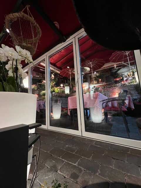 Am besuchten Donnerstagabend waren wir die ersten Gäste und man bot uns mehrere Tische zur Wahl an. Wir blieben in einer Art Wintergarten, durch den man in das Gebäude und das eigentliche Restaurant gelangt. Nach uns noch eine kleine Familienfeier mit sieben Teilnehmer und ein jüngeres Paar um uns herum. Im eigentlichen Restaurant treppaufwärts wurden einige weitere Tische mit gemischtem Publikum besetzt.