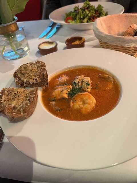 Dann das Highlight des Essens, meine Fischsuppe für 15,50 Euro. Der leicht sämige Fischsud hatte schon einmal die richtige Farbe, wie ich sie aus Südfrankreich kenne und er konnte auch geschmacklich mithalten; nur etwas heißer hätte der Fond sein dürfen. Als Einlage eine große Garnele und mehrere Fischstücke verschiedener Fischarten. Alle Stücke sorgfältig geschnitten, nicht zerkocht und grätenfrei. Dazu lagen auf dem Tellerrand zwei halbe Scheiben vom Brot mit Käse gratiniert. Insgesamt eine Fischsuppe der Spitzenliga und fünf Sterne wert.