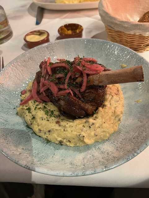 Meine Lammkeule auf Kartoffelpüree war sehr zart und machte auch optisch was her, thronend auf dem Püree. Dazu extra in einer Sauciere gereichter Jus rundete das Gericht ab. Was mich störte war die rote Zwiebel. Laut Karte eingelegt, aber im Anbiss wie roh und zu sauer mariniert.