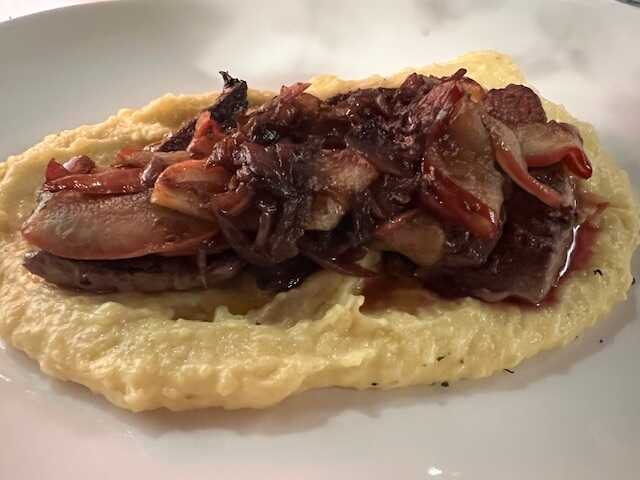 Mein Begleiter hatte sich für die Kalbsleber mit Zwiebeln und Apfel auf Kartoffelpüree für 33,50 Euro entschieden und mir aufgegeben, dafür die Höchstnote zu vergeben. Und da ihm auch noch das Vanilleeis sehr gut mundete, komme ich insgesamt auf eine Bewertung des Essens von 4,5 Sternen. Bleibt noch anzumerken, dass die Portionsgrößen passend sind, wenn man Brot, Butter und Vorspeise zur Gesamtsättigung hinzunimmt.