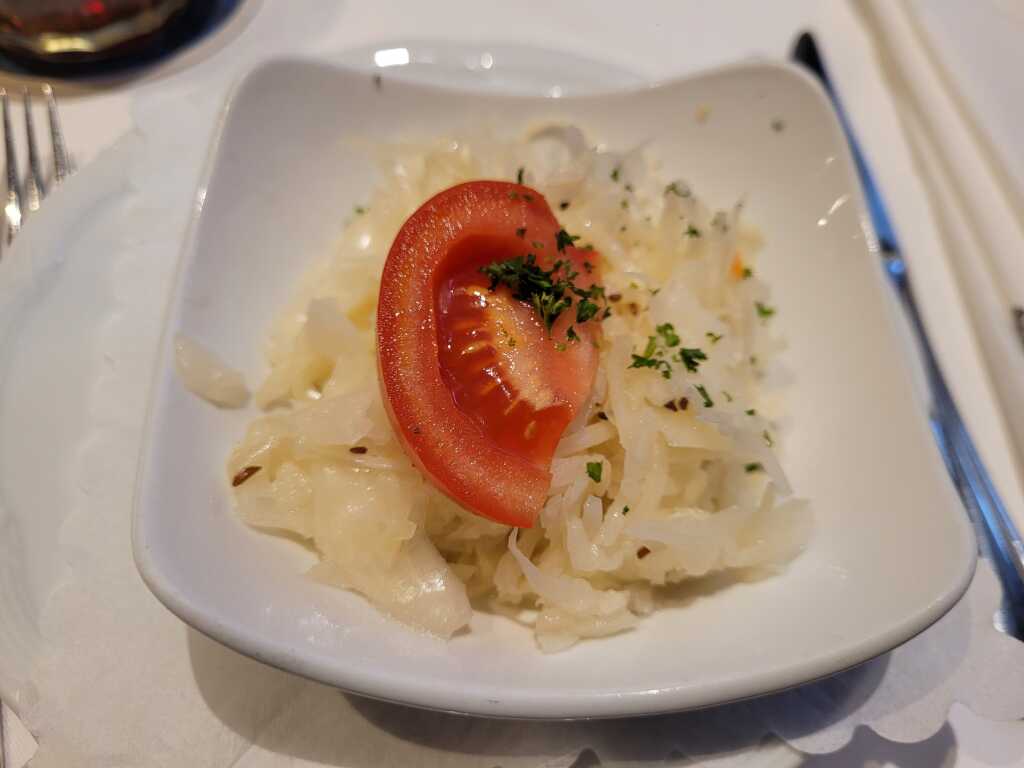 Herrlich. Obenauf gab es dann noch ein Viertel frische Tomate und ein paar Blätter frischer Salat und den obligatorischen Möhrenraspel. Für den Krustenbraten gab es "nur" ein großes Schälchen dieses sehr gut schmeckenden Weißkrautsalat.