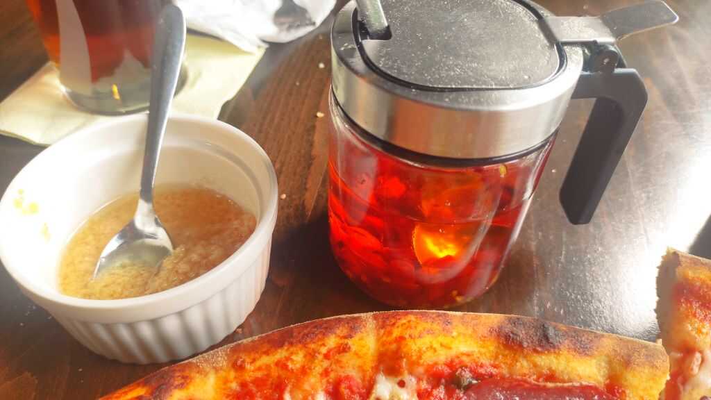 Die erbetenen Scharfmacher zu meiner Pizza (Chili- und Knoblauchöl) wurden fast Zeitgleich ebenfalls gebracht.