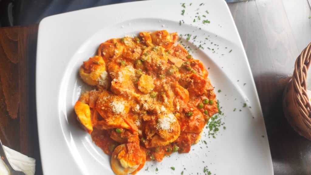 Meine liebe Frau wurde in der Al Forno Abteilung fündig. Tortellini mit Schinken, Ei, Hackfleischsoße und Sahne (12,50) sollten es sein. Allerdings ohne „al forno“, war auf Nachfrage überhaupt kein Problem darstellte. Im Gegenteil, es wurde von der Küche nachgefragt, ob auch Erbsen dabei sein dürften, was meine Frau freudig bejahte.