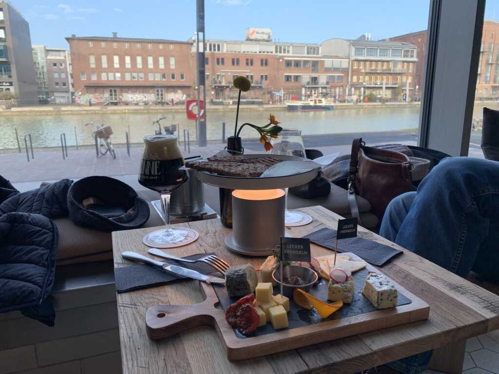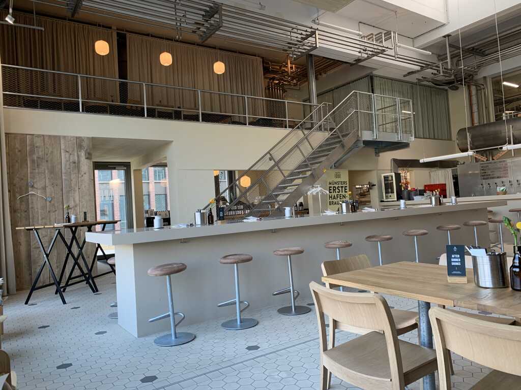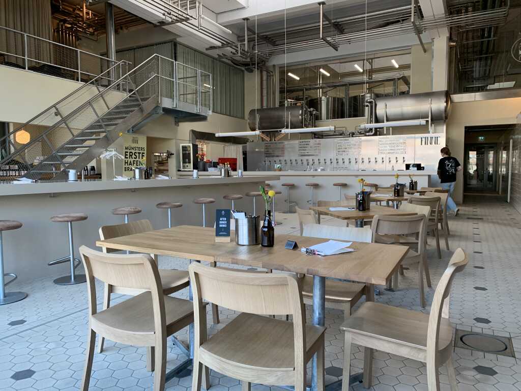 Der nördliche Teil des Hafenbeckens ist seit Jahren urbanisiert und Ausgehmeile für Münsteraner und Besucher. Jetzt ist auch am südlichen Teil das letzte bisschen Gewerbe weg, nur das Kraftwerk der Stadtwerke Münster wird noch geduldet. Auch hier residieren nun in prunkvollem Ambiente Dienstleister und zunehmend auch Gastronomie. Ein früher Anlieger war die Hafenkäserei Münster. Siehe die Berichte zu der hier bei GG. So ganz scheint sich das nicht gelohnt zu haben, denn inzwischen ist die Produktion dort still gelegt und die Hafenkäserei affiniert und vertreibt ihre Produkte nur noch in ihrer Gastronomie im Gebäude. Den stillgelegten Teil hat ein Münstersches Start-up übernommen, die Finne Brauerei. Craft Bier ist ja seit Jahren ein Trend, und die Jungs von der Finne Brauerei waren ganz früh dabei und sind dem Start-up Status inzwischen entwachsen. Es bot sich die Chance, die Produktion in die Räumlichkeiten der Hafenkäserei zu verlegen, was man dann auch nutzte. Und was gehört zu einem zünftigen Brauhaus? Eine Gastronomie natürlich. Dort wurden Netzwerke genutzt und so kam es, dass Pascal Hinkelammert seinen Posten als sous chef des Coeur d'artichaut verließ ( sicher nicht zur Freude von Freund und Chef Frederic Morel ) und die Aufgabe annahm, am Hafen eine Brauhaus Gastronomie zu eröffnen.