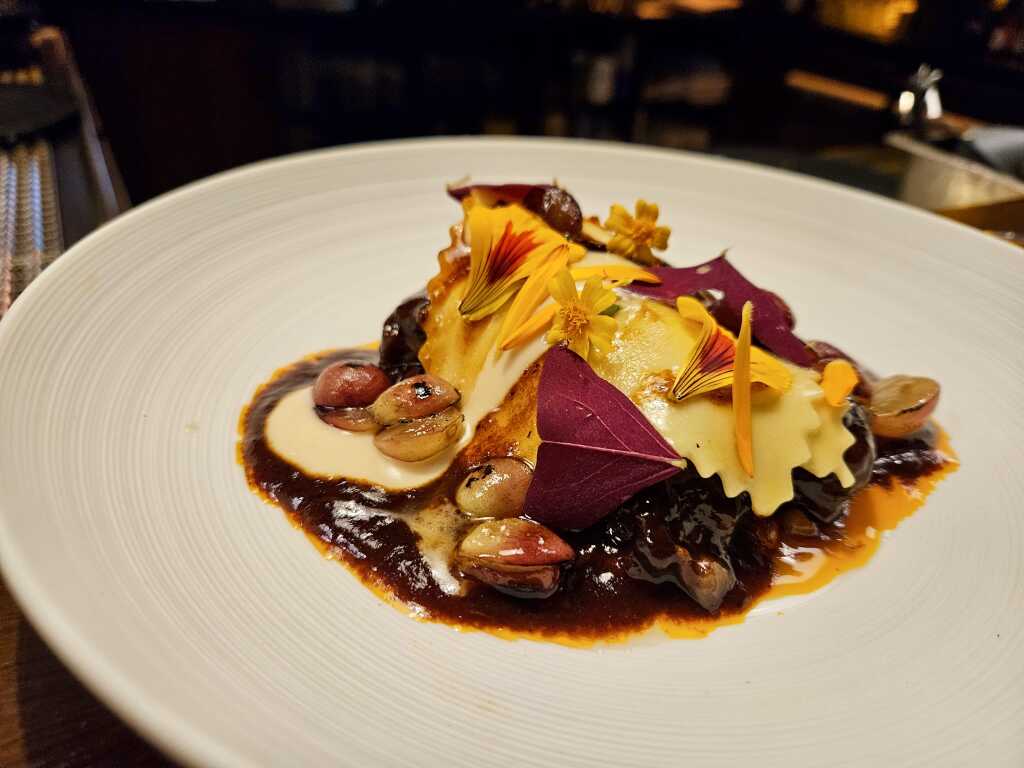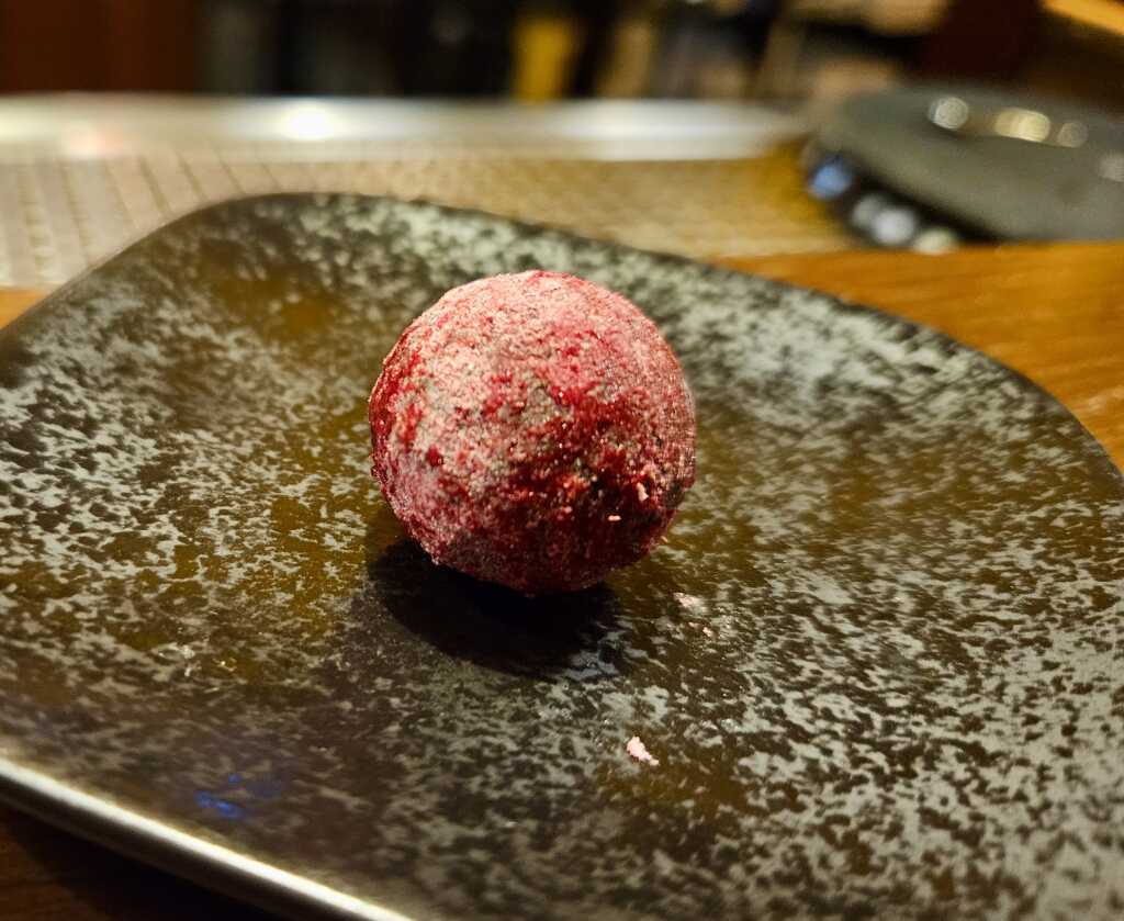 Hunsrücker Damhirschrückensteak auf Apfelrotkohl, Trüffelkroketten, frischer Trüffel