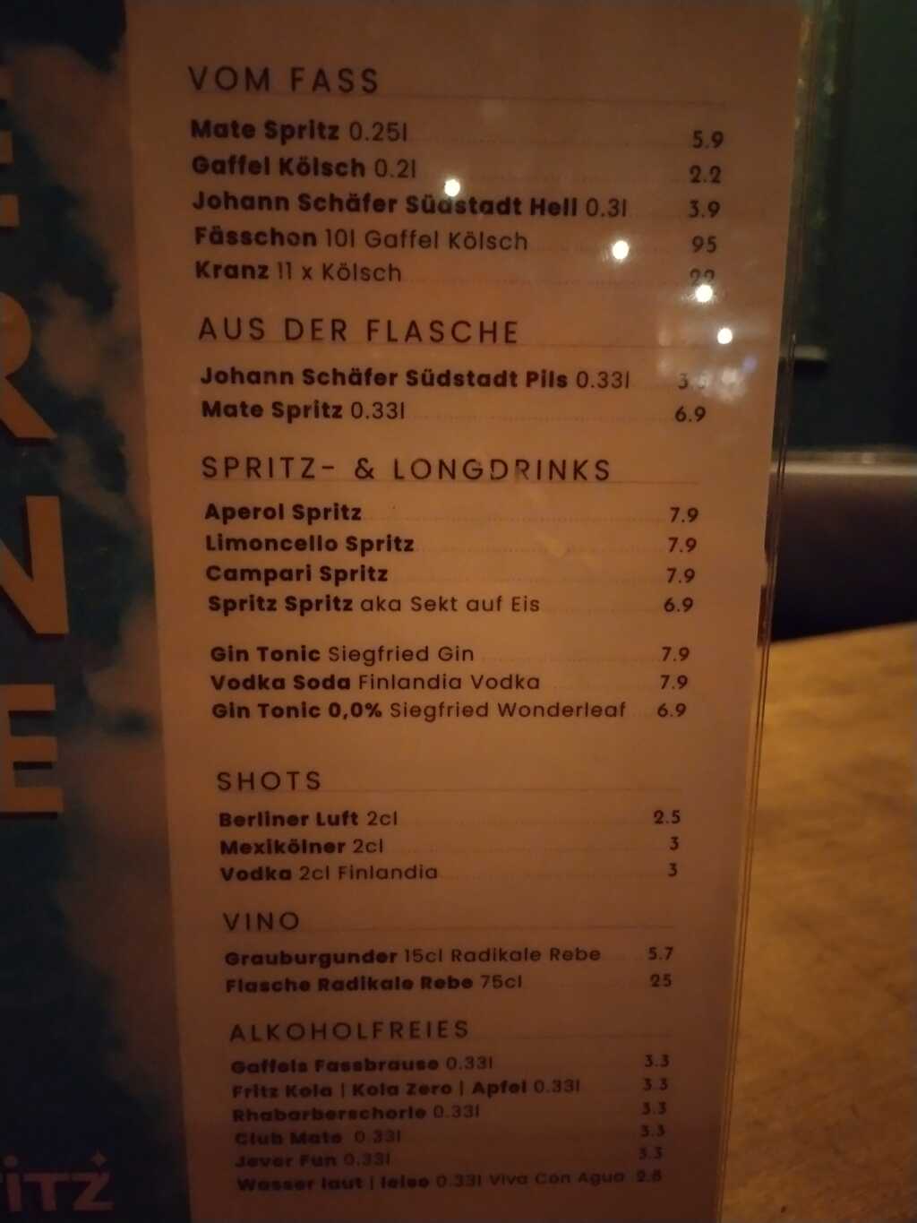 Wo man halt mal hier ist, bleibt man doch da und will nur ein Kölsch trinken und schaut mal weiter, was es noch in der Nähe gibt.... Aber das haben wir dann doch nicht gemacht, denn die Stimmung im Spritz ist sehr gut. Am späten Dienstagabend sind die wenigen Plätze zur Hälfte besetzt. Musik in unterhaltsamer Lautstärke. Ein aufmerksamer, aber unaufdringlicher Bediener, der schnell merkt, wenn das Kölsch leer ist. Mit 2,20 Euro ein normaler Preis.