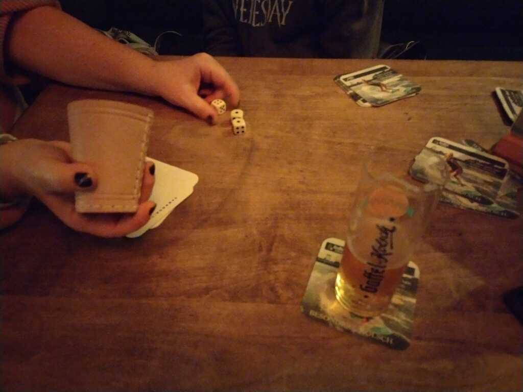 Mir fällt auf, dass andere Gäste an der Theke Würfelbecher erhalten. Ich frage nach und erhalte ebenfalls einen Würfelbecher mit 4 Würfeln ohne Gebühr oder Pfand. Das ist doch ziemlich sympathisch und lässt die Gäste länger sitzen.