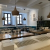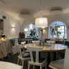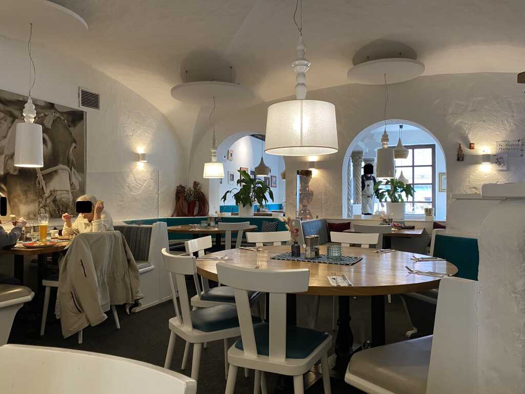 Es gibt hier Teils runde , Teils Eckige Tische. Mal Stühle , mal Bänke. Es ist alles in weiß und blau gehalten. Blumen zieren die Abgrenzungen, es ist hell Beleuchtet und an der Wand gibt es ein paar Bilder. Säulen sind auch vorhanden für den griechischen Flair.