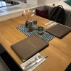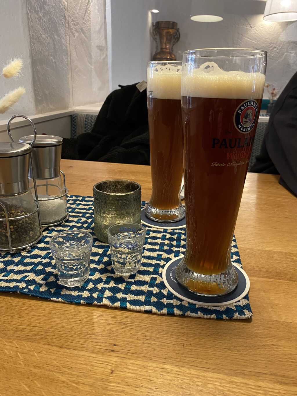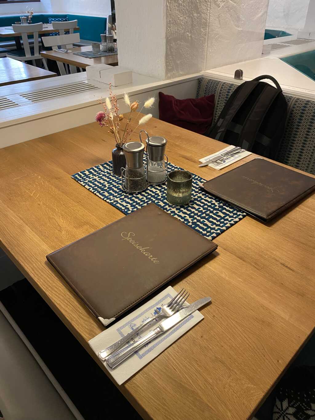 Auf dem Tisch gab es ein blau-weißes Stoffdeckchen, eine Vase mit Trockenblumen, ein Glas mit einem Teelicht und einen Ständer mit Salz-und Pfeffermühlen. Es ist auch bereits eingedeckt mit den griechisch Kurs Servietten und darauf liegt das Besteck.