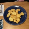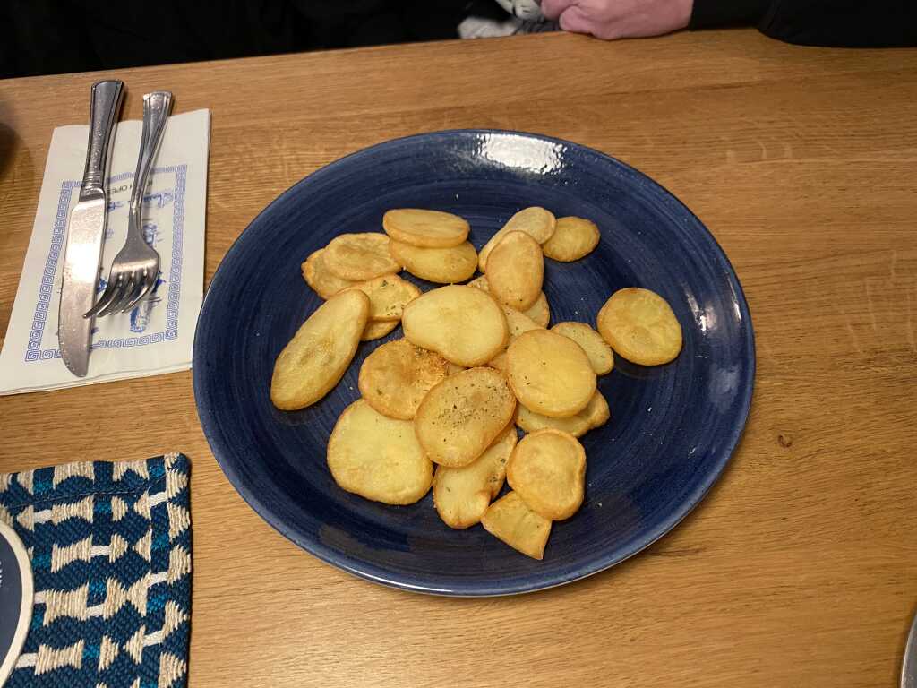 Die Kartoffelscheiben waren schön frittiert worden, außen richtig knusprig und innen noch weich. Sie waren auch nicht fettig. Beim würzen hat sich nichts geändert. Ein Streifen oben drüber hat die Kräuter-Salz-Würze abbekommen, der Rest nichts. Wir fänden es schöner wenn die Würze gleichmäßig auf allen Scheiben verteilt wäre.