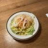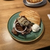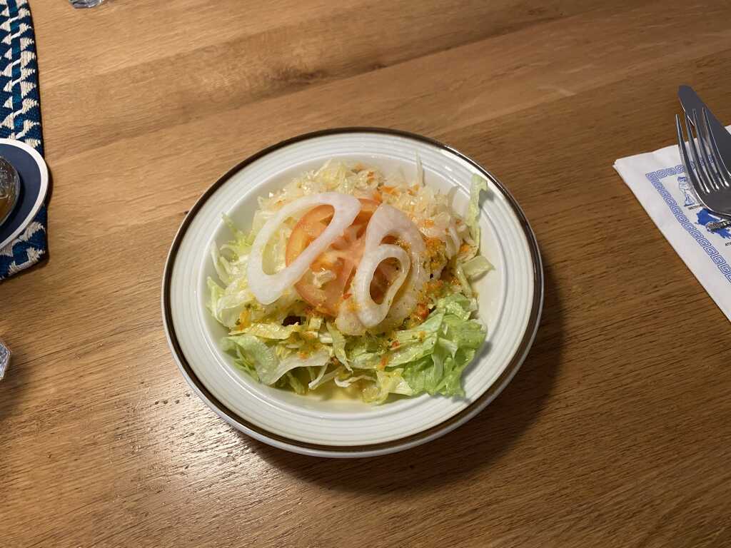 Der Beilagensalat bestand wieder aus Weißkraut und Gelberübenstreifen, alles frisch. Er war schön angemacht mit einem leichten süßlichen Touch. Dazu gesellte sich in Streifen geschnittener Eisbergsalat. Die obligatorische Tomatenscheibe ( die in dieser Jahreszeit keinen Geschmack hat ) gab es oben mit drauf und ein paar grobe Zwiebelringe. Das Dressing fanden wir diesmal besser, schöne Säurenote, mit kleinen Gemüsewürfelchen versetzt und gut abgeschmeckt. Ein paar Kräuter gesellten sich auch mit dazu.