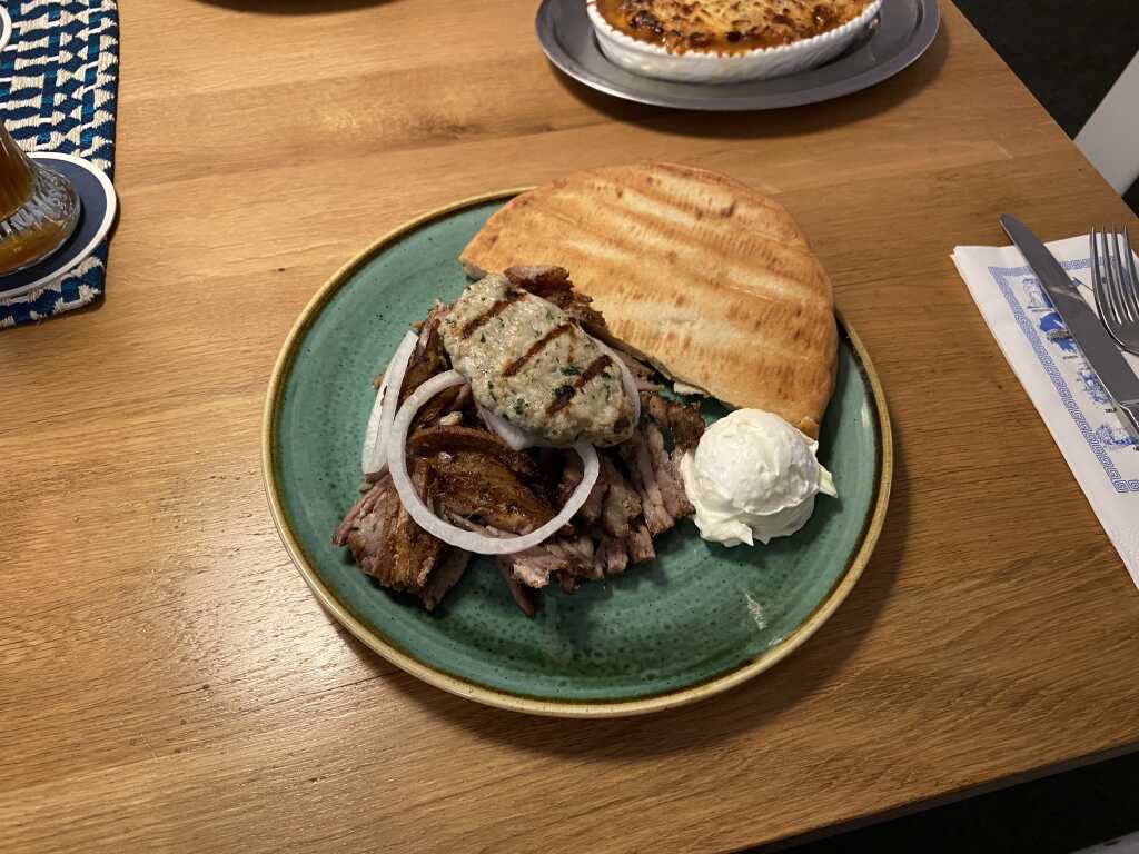 Beim anderen Teller gab es zwei übereinanderliegende hälften Pitabrot. Es war noch schön warm und außen knusprig , innen aber schön weich. Geschmacklich passte es . Das Tzatziki war etwas fester von der Konsistenz, aber doch schön cremig. Es gab kleine Gurkenstreifen mit drinnen und von der menge an Knoblauch die vertreten war konnten wir nicht klagen. Es war auch schön abgeschmeckt worden. Das Souzouki war saftig gebraten , mit Kräutern verfeinert und richtig gut gewürzt worden. Ich bin da eher nicht der Fan davon, aber das schmeckte sogar mir, würde ich sofort hier wieder essen. Ein paar frische Zwiebelringe gesellten sich dazu. Das Gyros war zum teil knusprig geröstet worden aber trotzdem noch zart und saftig. Hier kann man auch würzen und traut sich das auch , es war lecker .